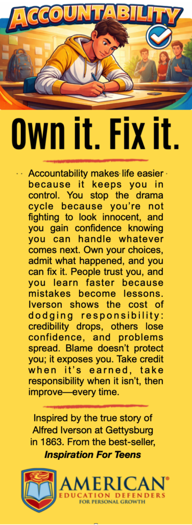 Being accountable shows others they can trust you, and trust is what makes someone a true leader. After Robert E. Lee  accepted responsibility, even his former enemies respected him. That same kind of honesty—owning your challenges without excuses—builds lasting trust in your own life. “The integrity of the upright guides them, but the unfaithful are destroyed by their duplicity.” — Proverbs 11:3
